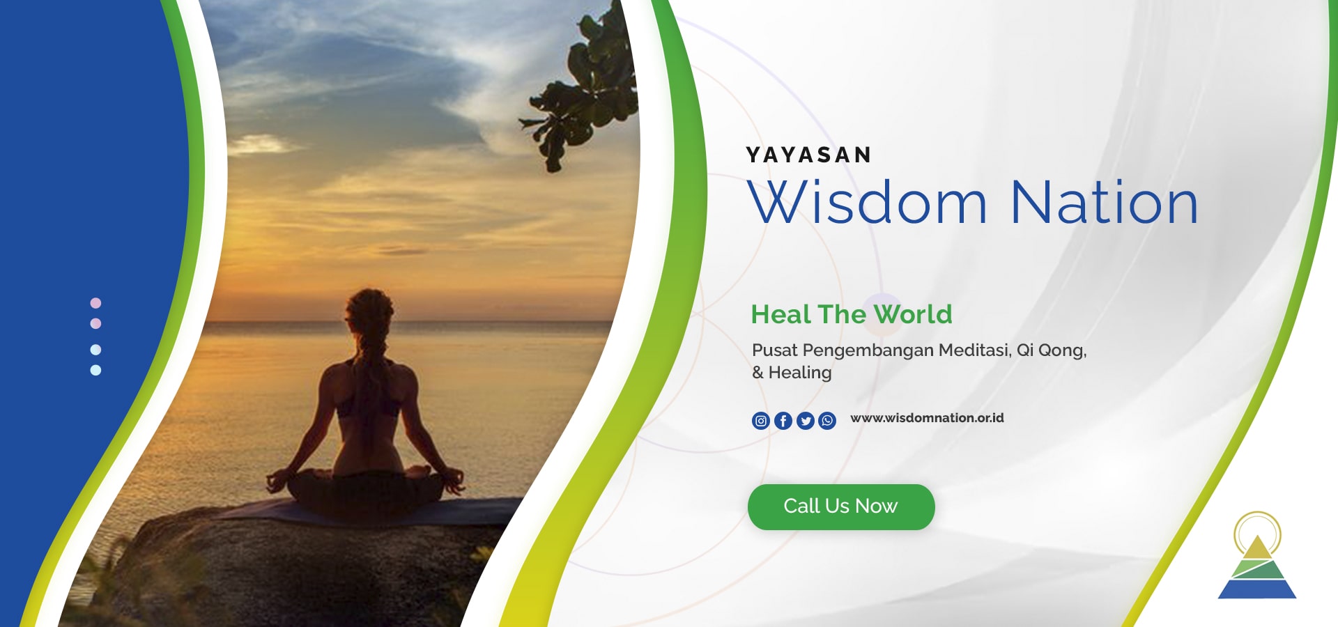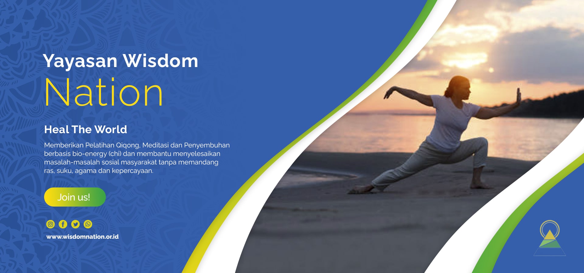 Yayasan Wisdom Nation merupakan salah satu yayasan yang berfokus pada meditasi, pelatihan Qi Qong, Healing, dan bakti social. Yayasan Wisdom Nation hadir bagi anda yang membutuhkan kedamaian keharmonisan rumah tangga, karir dan usaha yang meningkat dan berbagai masalah kehidupan lainnya dengan menggunakan cara meditasi.